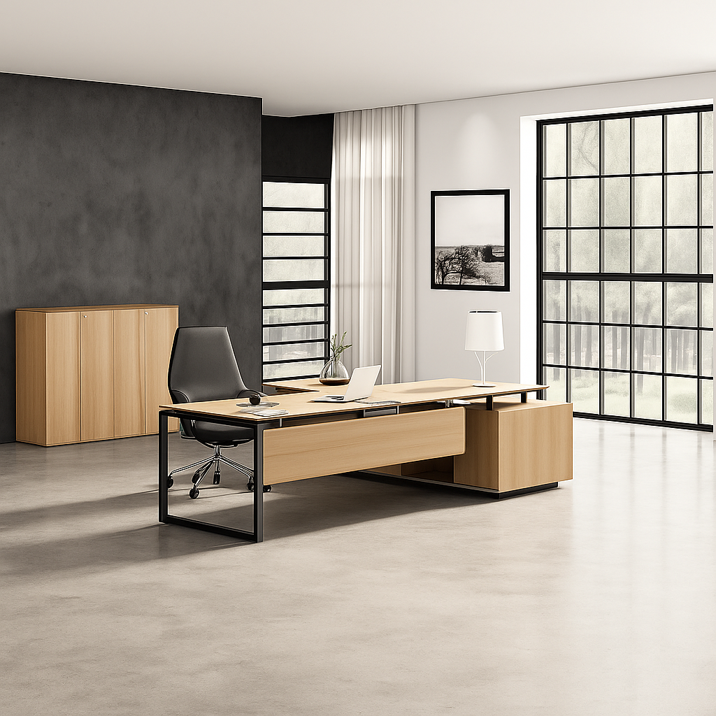The main desk is supported by a minimalist yet sturdy metal frame, adding a modern industrial edge while maintaining durability and stability for everyday use. Combining sophisticated aesthetics with practical features, this desk is ideal for executive offices, modern workspaces, and professionals who value both style and performance in their furniture.